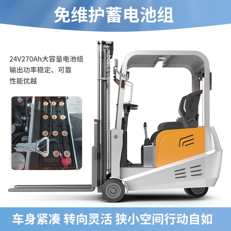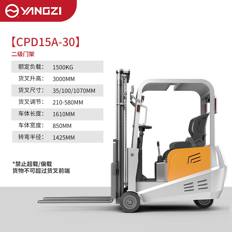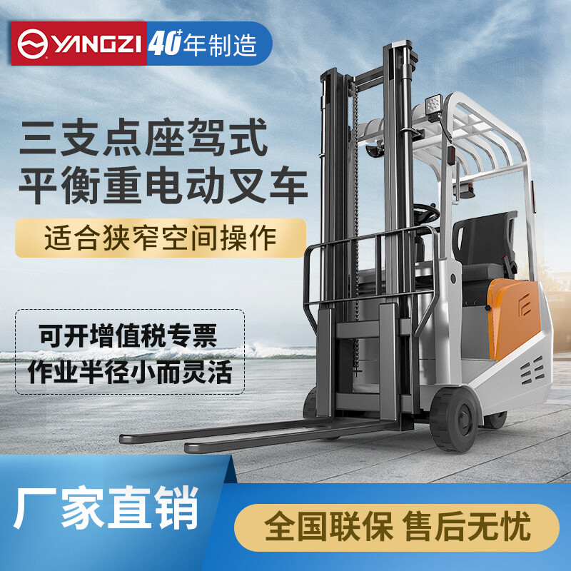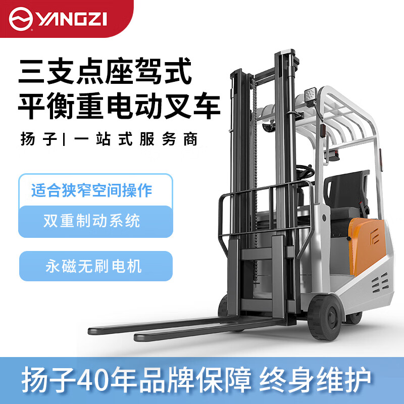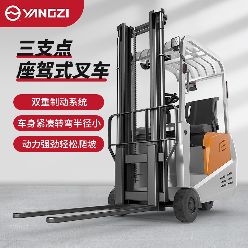 揚(yáng)子三支點(diǎn)座駕式平衡重電動叉車CPD-A,動力強(qiáng)能耗低免維護(hù)低噪音,車身小巧/全車LED警示燈/制動雙保險(xiǎn)